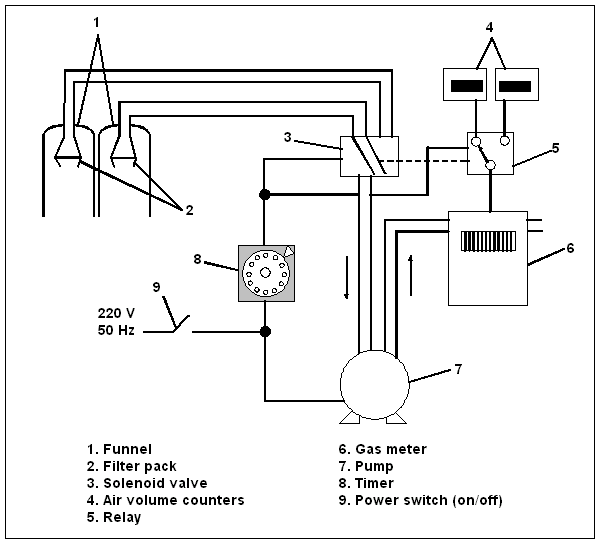In order to facilitate operation of the sampler, it is possible to connect two or more air inlet and filter pack units to the same pump and gas metering device, letting timers control valves. This enables a collection of samples (exposed filter packs) and an inserting of new filter packs at a convenient time and without interruption of the sampling process. A schematic indication of how this may be carried out is indicated in Figure 3.2.1.